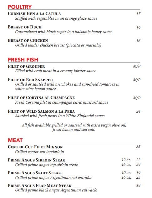 Indulge in the Ceviche Catula or the delicate Salmon Carpaccio, each prepared with the finest ingredients. The Spinach & Salmon Salad captivates with its refreshing blend of flavors, while mains like the tender Center Cut Filet Mignon are sure to impress.